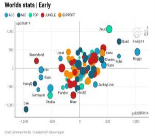 体育资讯10月21日称 外媒发布截至目前世界赛前14分钟经济差与经验差数据图(其中横坐标代表经济差,纵坐标代表经验差,图中圆圈大小代表14分钟的击杀与助攻数的平均值,以4、1.5、0.4为节点):Zeus经验差最高;Doggo经济差最高。